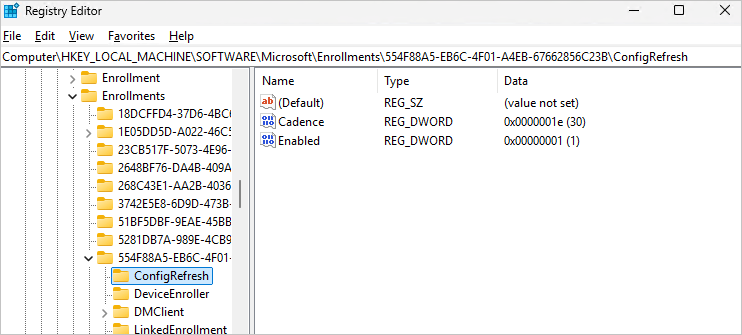 Computer\HKEY_Local_Machine\Software\Microsoft\Enrollments\<policy ID>\ConfigRefresh
